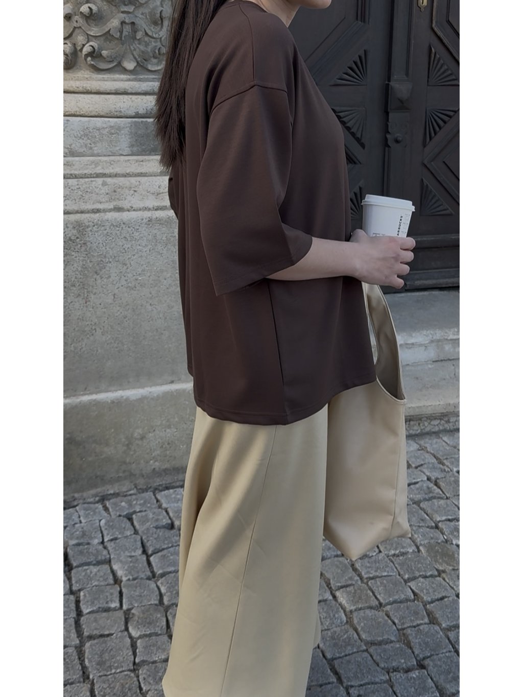 Hnědé basic oversize tričko z příjemného chladivého materilu, které by nemělo chybět v žádném šatníku. Skvěle padně, super střih, snadno se kombinuje, prodloužená délka rukávů.