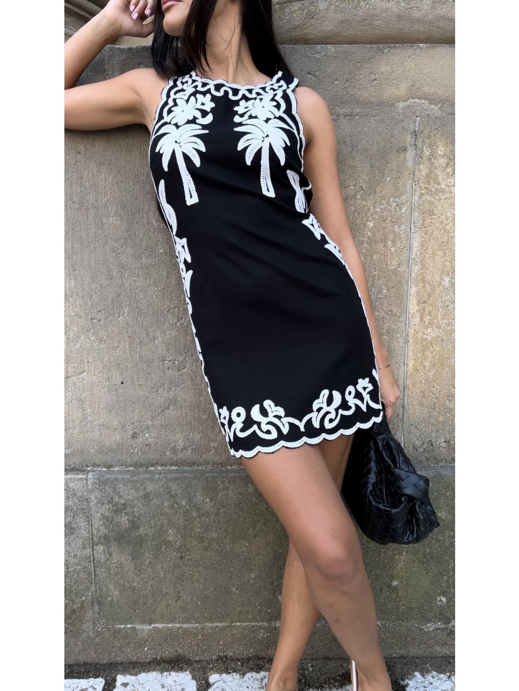 Černé lněné šaty s bílou výšivkou ve tvaru palmy. Materiál mic bavlna a len. Materiál je pevnější a drží tvar.
